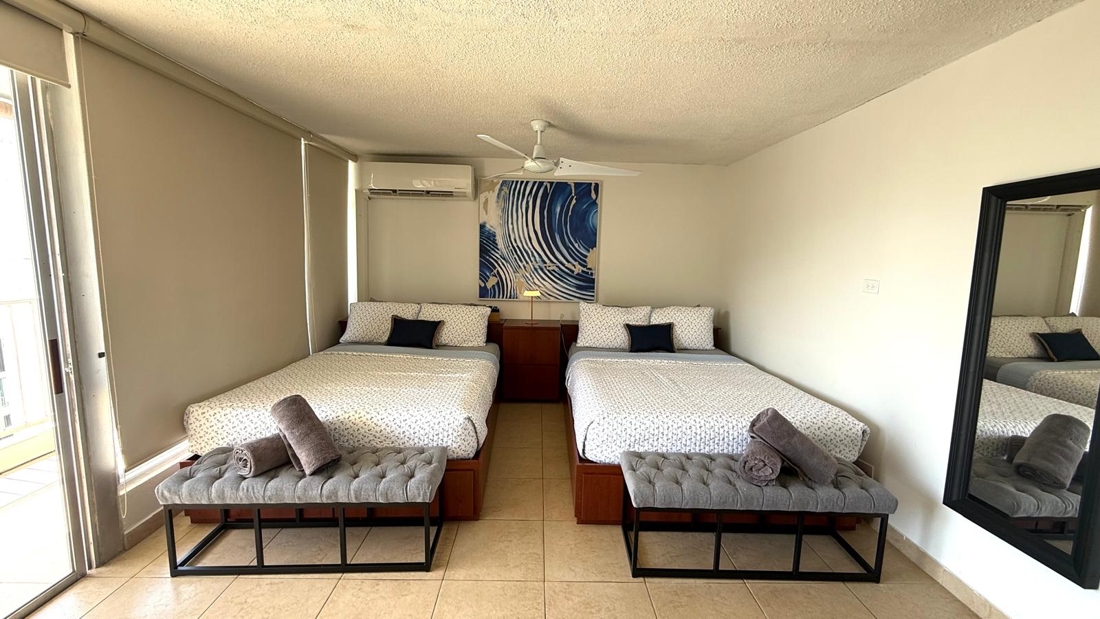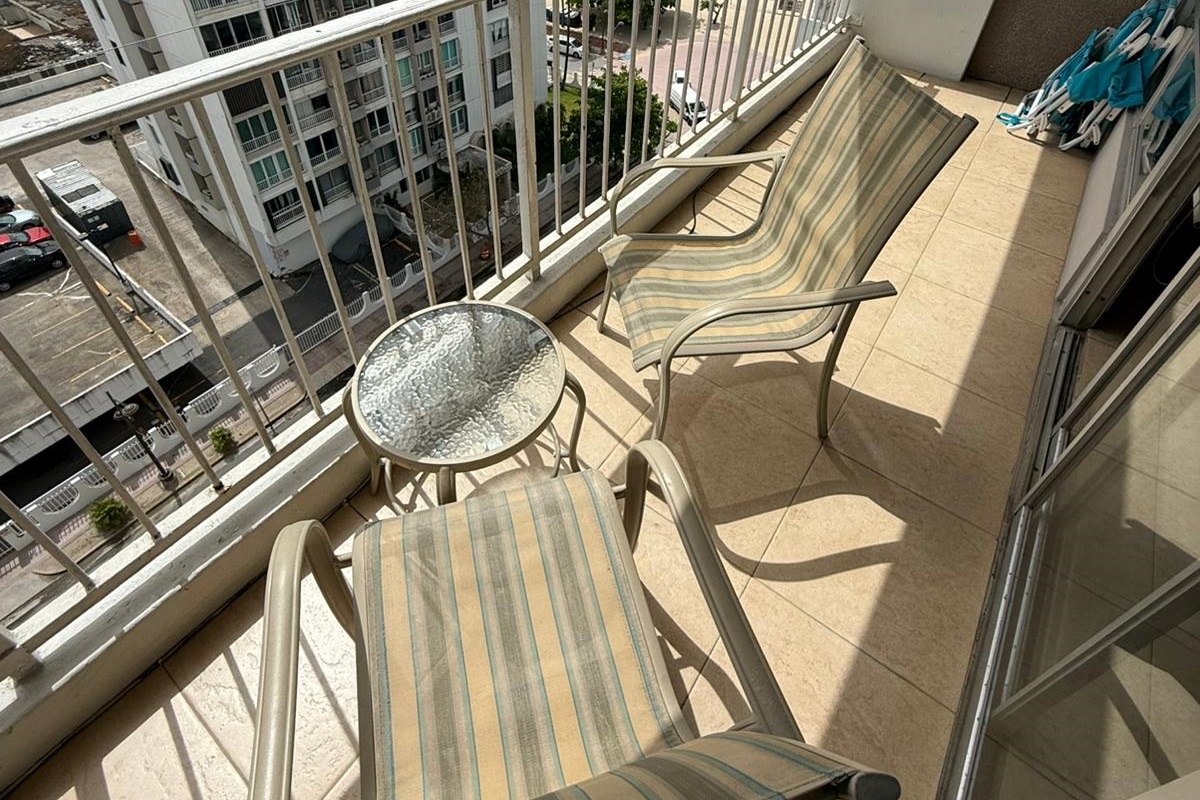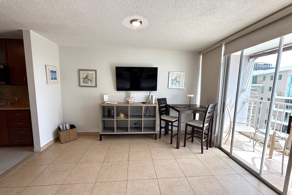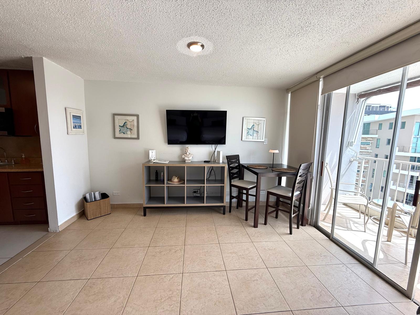 SPACE: The apartment has a 500 sqft. approx. of dimension. Open the glass and have a nice side view of the ocean. Included a dining table with 2 stools. For those warmer days, you can close the windows and sliding doors, and the A/C in the rooms will cool down the place.