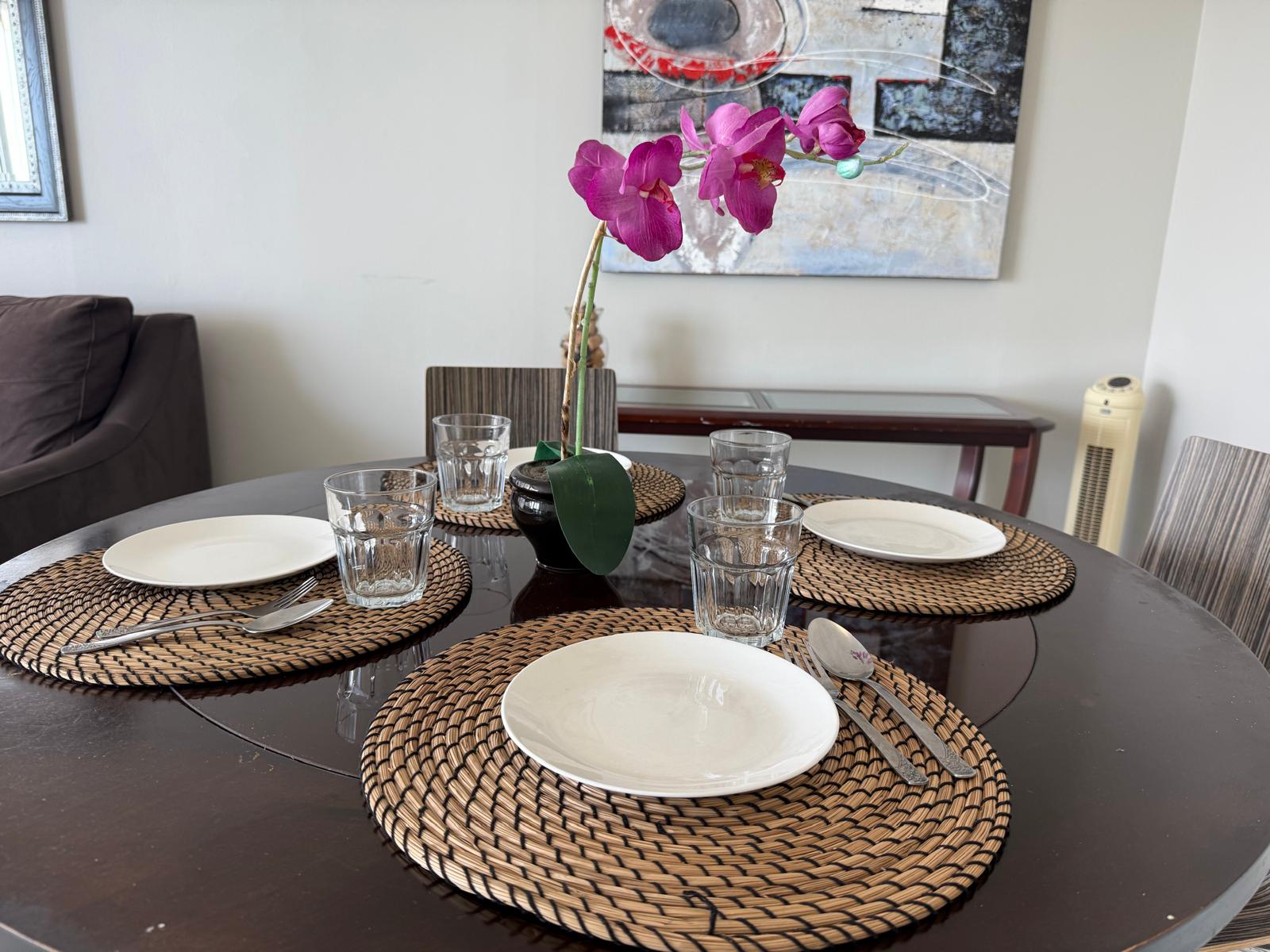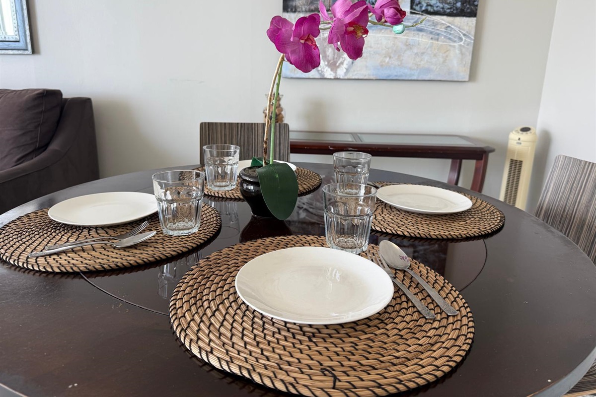 LIVING ROOM: The living and dining room are beautifully designed and great for having your morning coffee to plan your day. The living room area has a very comfortable sofa bed for relaxing viewing of your favorite movie on the flat screen TV. You may choose to open the sliding doors to take advantage of the breeze, use the fan, or central air. This space is comfortable for lounging, having a drink, and planning your next move during your vacation. The dining room glass table can fit up to 4 people comfortably.