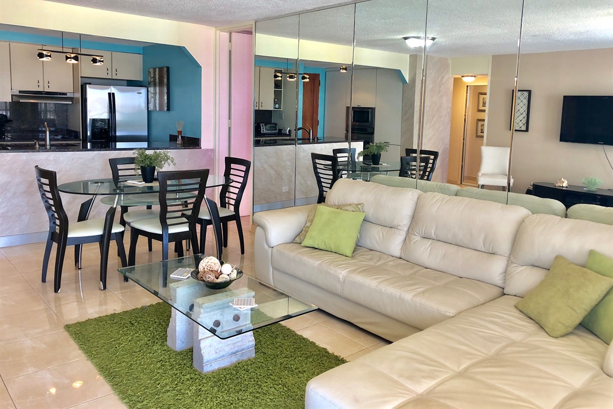 THE SPACE: The living and dining area are bright and comfortable, with a large sofa, smart TV, and dining table for up to four guests. Sliding doors open to let in the ocean breeze, or you can relax with the fan or central air conditioning.
