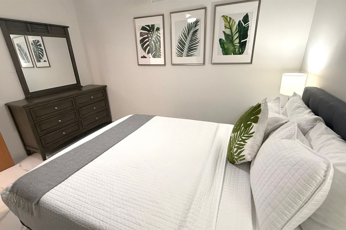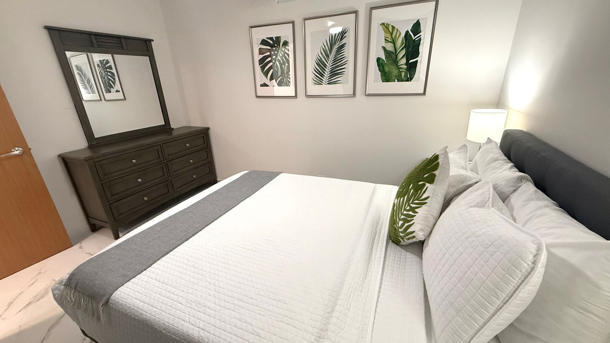 Master bedroom: equipped with a Queen size bed, nightstand, dresser. Closet with cloth hangers.