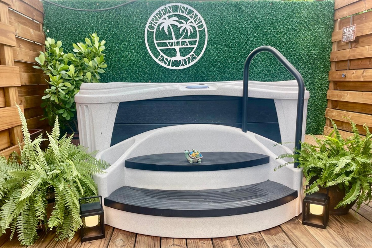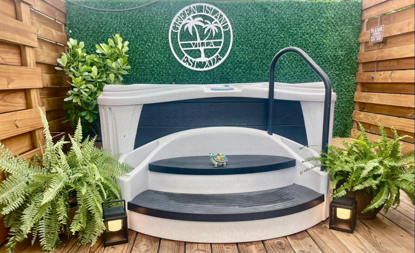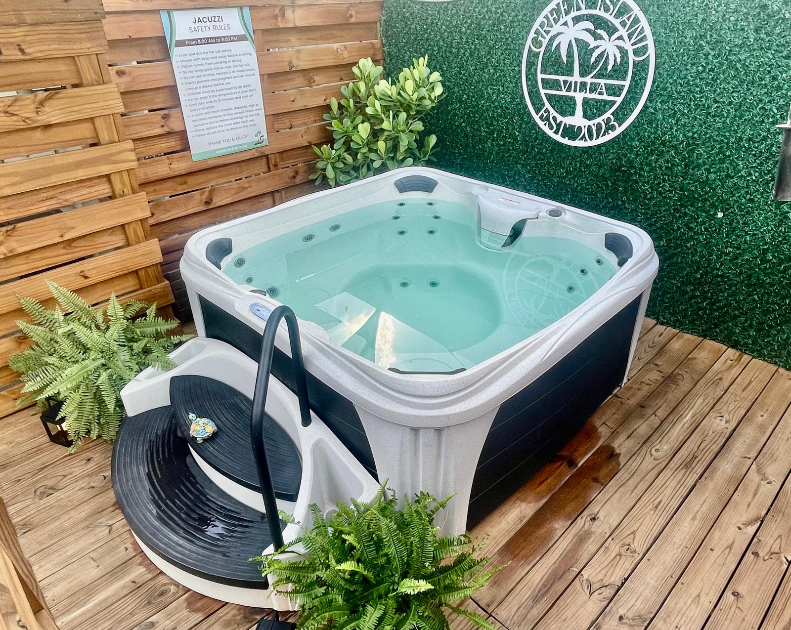 ACCESS: Nestled in the backyard oasis, our inviting Jacuzzi creates a haven of relaxation. Surrounded by lush greenery, this retreat features bubbling water, soothing jets, and an ambiance—a perfect setting to unwind under the open sky.