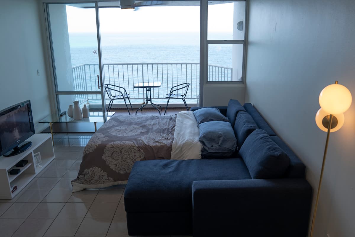 The living and dining room are beautifully designed and great for having your morning coffee to plan your day. The living room features an unbeatable view of the beach, smart TV with has a sofa bed Perfect for sleep 2 guest), lounge chair. You may choose to open the sliding doors to take advantage of the breeze or use the fan This space is comfortable for lounging, having a drink, and planning your next move during your vacation. If you need to work, we have a hi speed Wi-Fi a desk with chair.