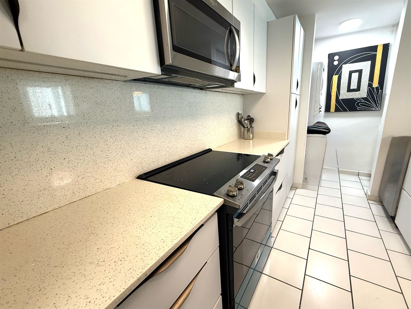 KITCHEN: The bright open kitchen is equipped with a full-size fridge, top stove, oven, microwave, dishwasher, coffee maker, cooking utensils, toaster, everything you need for basic meals. A washer and dryer are available in the apartment for light loads.
