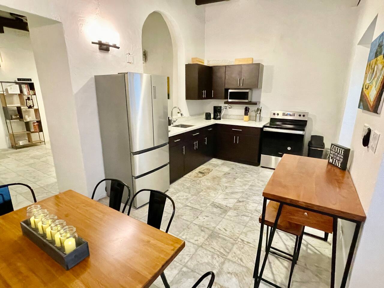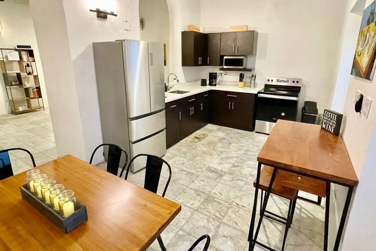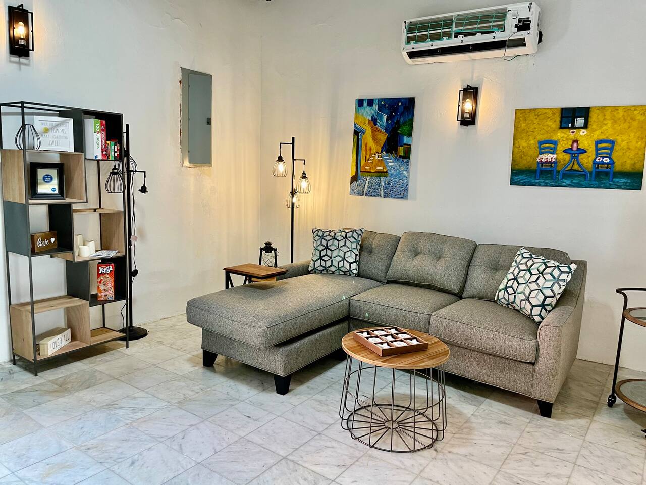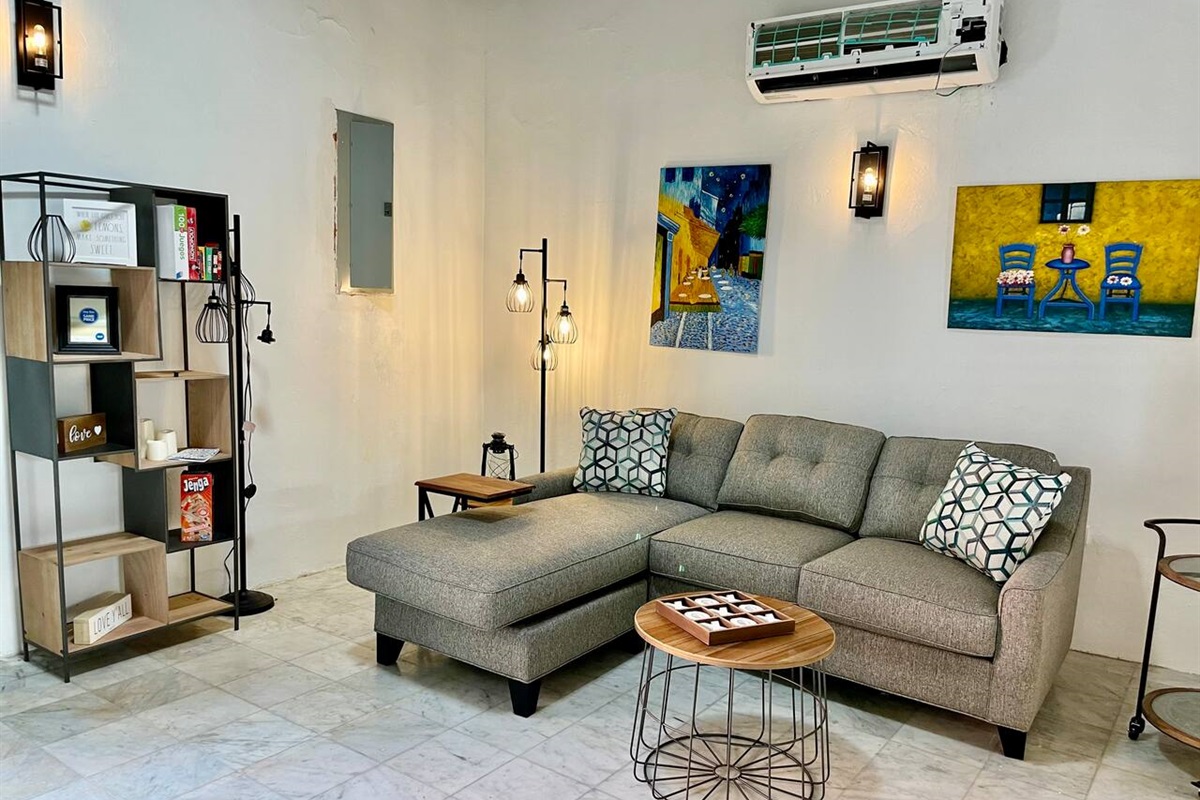 Villa A: As soon as you enter the villa an iconic design feature of the colonial architecture Old San Juan is famous for. You will see the living room has a large and comfortable sofa and a flat screen TV. There is a dining room directly besides the large and kitchen. The kitchen has a counter with barstools, stove with oven, microwave, fridge, and everything you would need for an expended stay.
